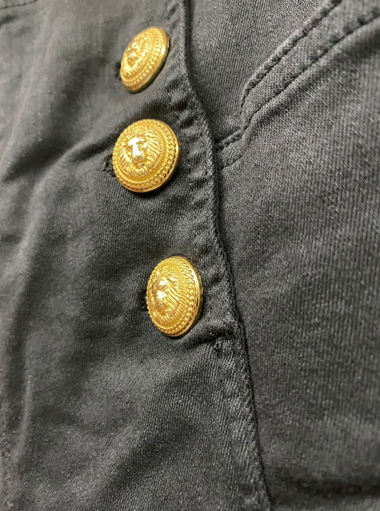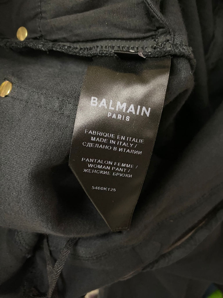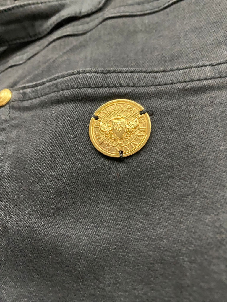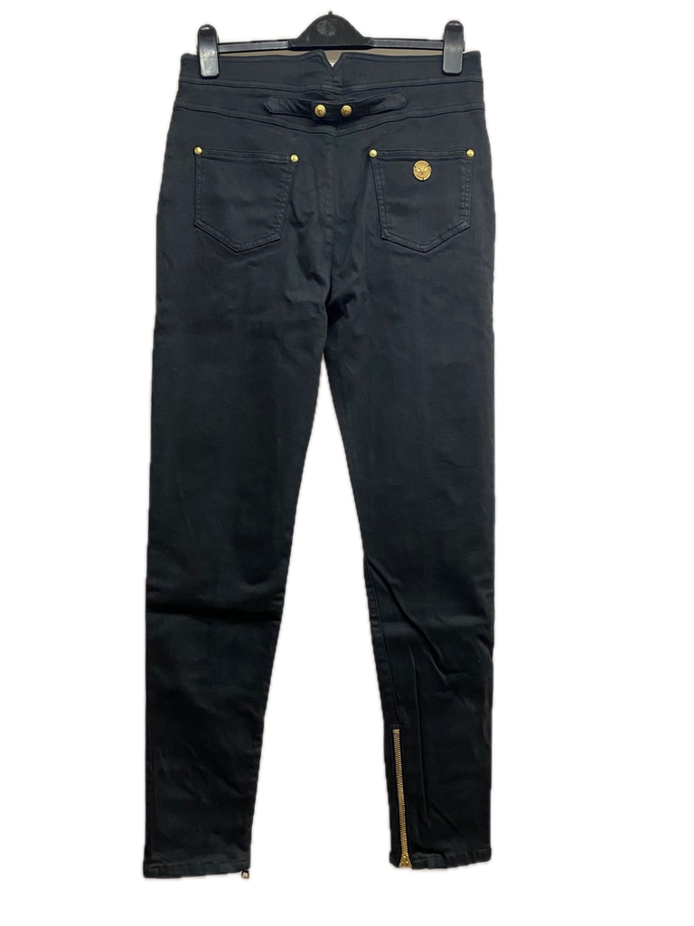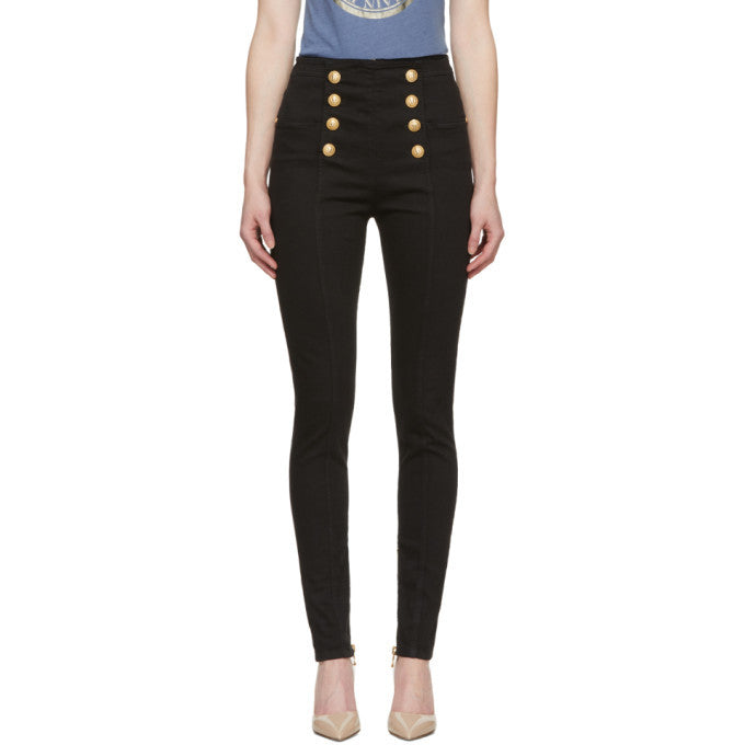 Opt for a powerful look that's right in line with the label's aesthetic courtesy of these Balmain trousers. Crafted from Black denim for a second-skin fit, the pair is regally finished with rows of the house's signature golden buttoning down the front for instant recognition. Team yours with dizzying heels as the lookbook does. Side slit pockets, back pockets zipper fly, button fastening belt loops zipped ankle cuffs. Slim-leg High-waisted Inseam length.