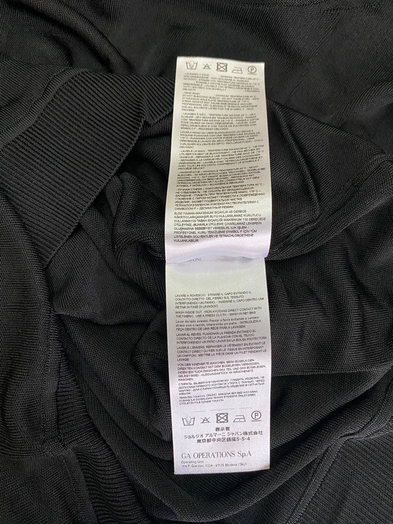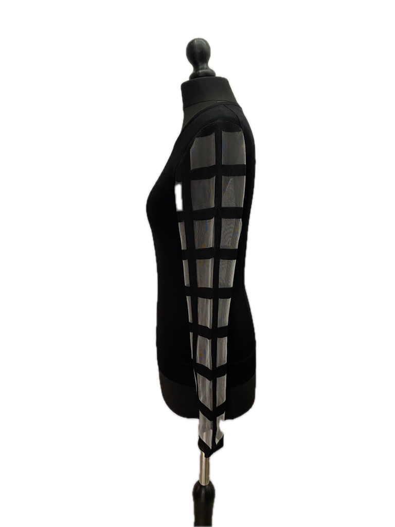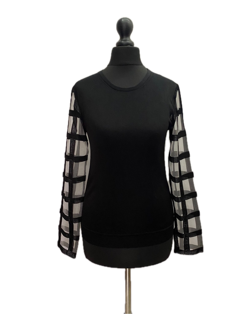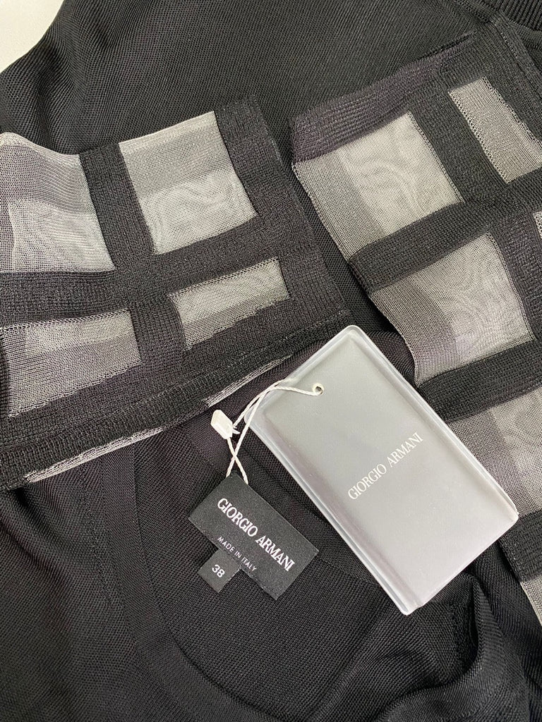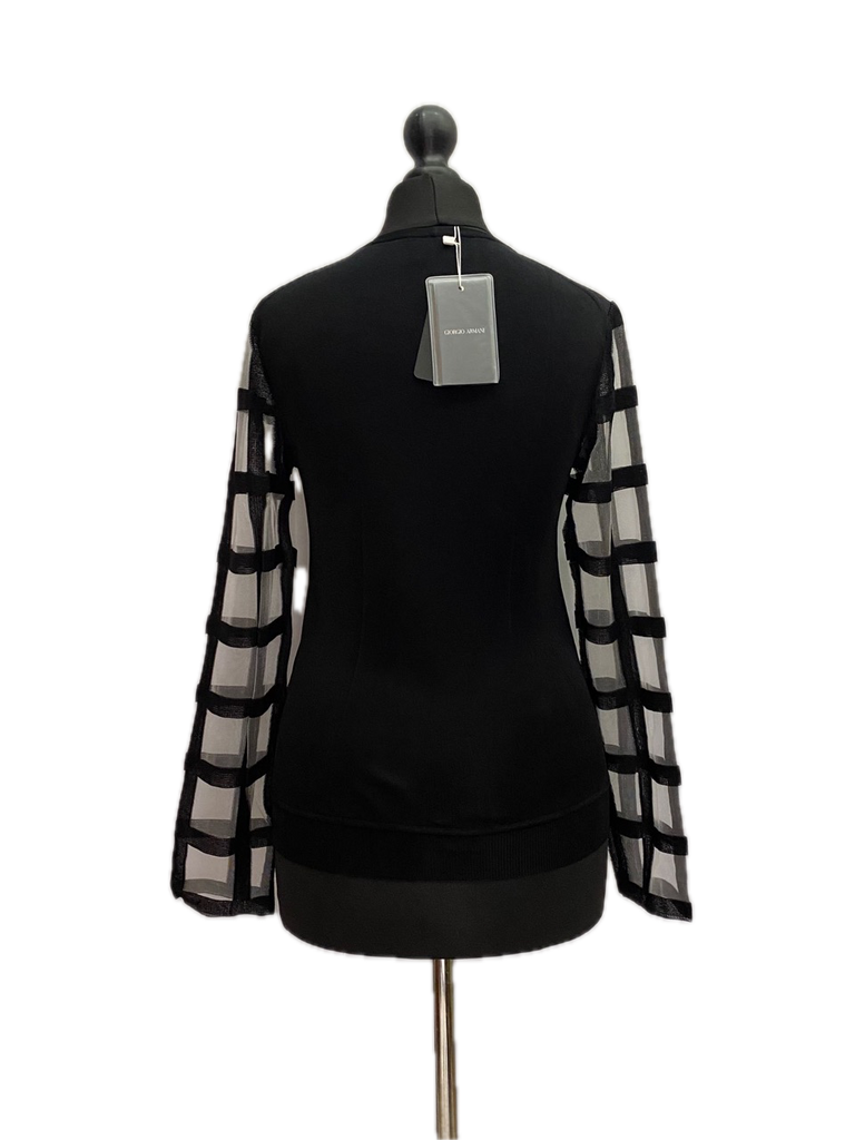 Elevate your knitwear edit with this striking Giorgio Armani jumper — a refined blend of luxurious comfort and contemporary design. Crafted in Italy, the body is made from a smooth, fine-gauge viscose knit that offers a flattering, streamlined silhouette. The standout feature lies in its sleeves: sheer mesh panels overlaid with bold grid stitch detailing, creating a sculptural, see-through effect that adds depth and modern edge.