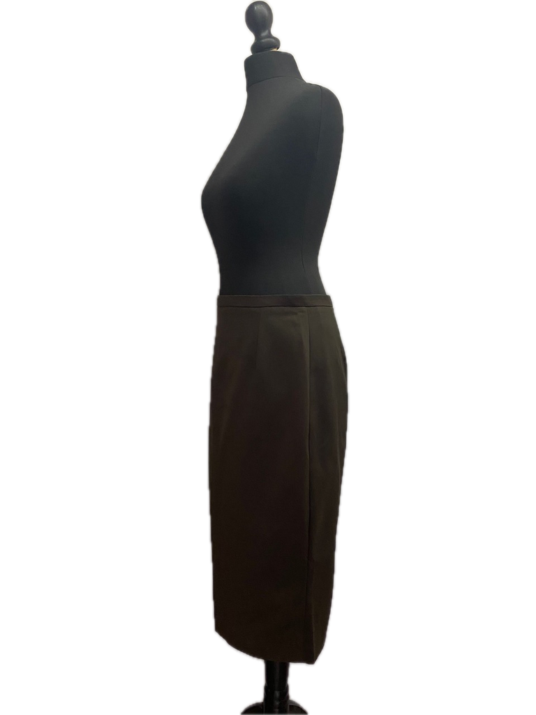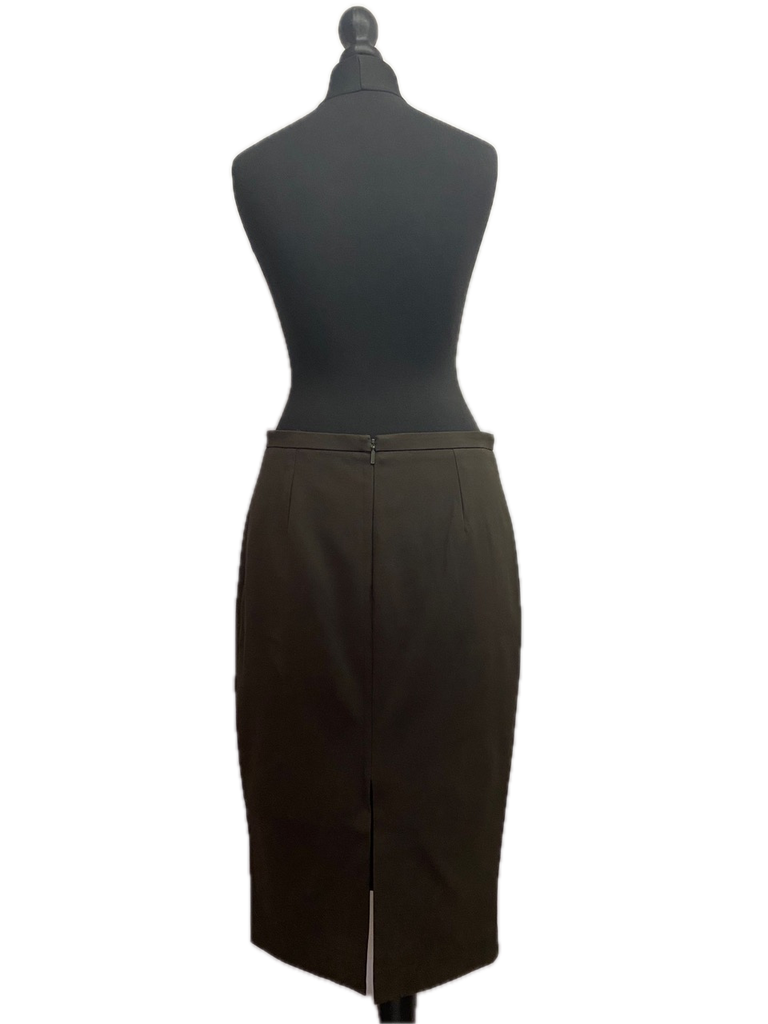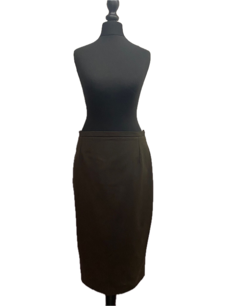 A beautifully tailored classic from Gucci, crafted in Italy from a structured cotton-blend with a subtle stretch for a sleek, flattering fit. This elegant rifle-green pencil skirt falls below the knee, sculpting a refined silhouette suitable for both professional and evening styling.
