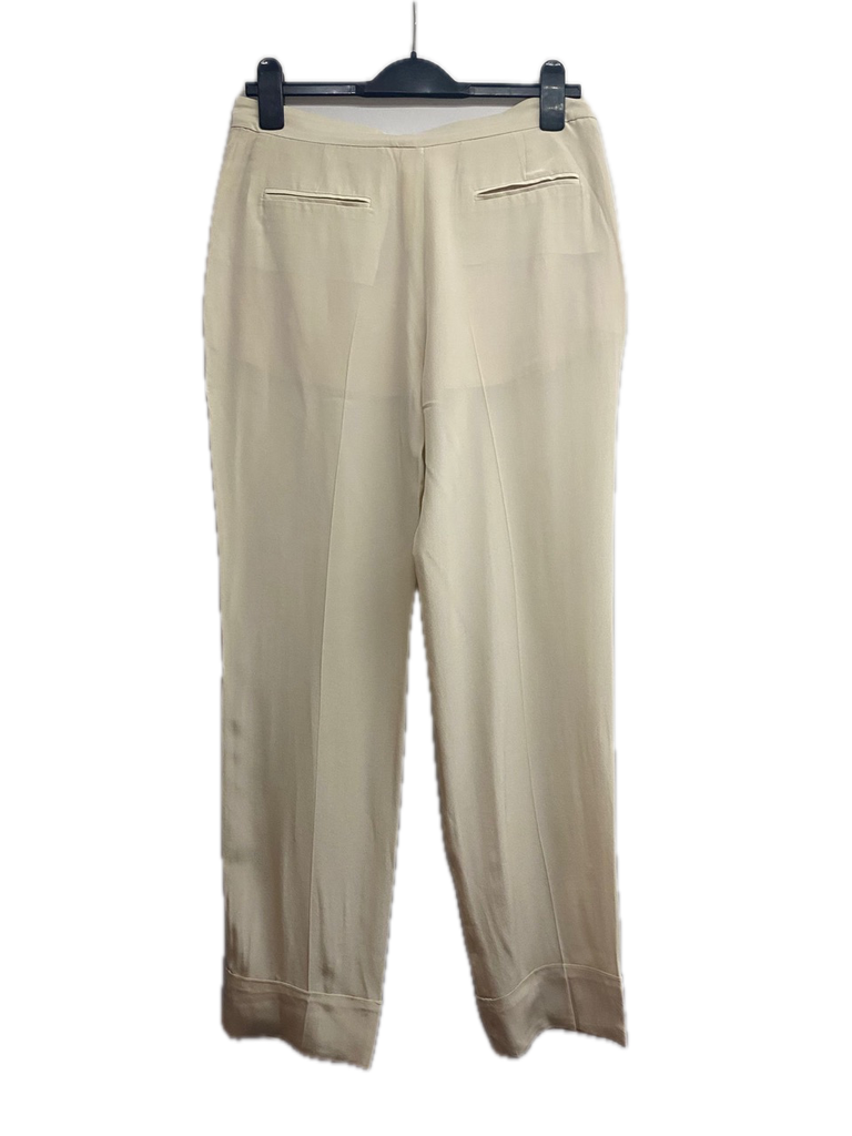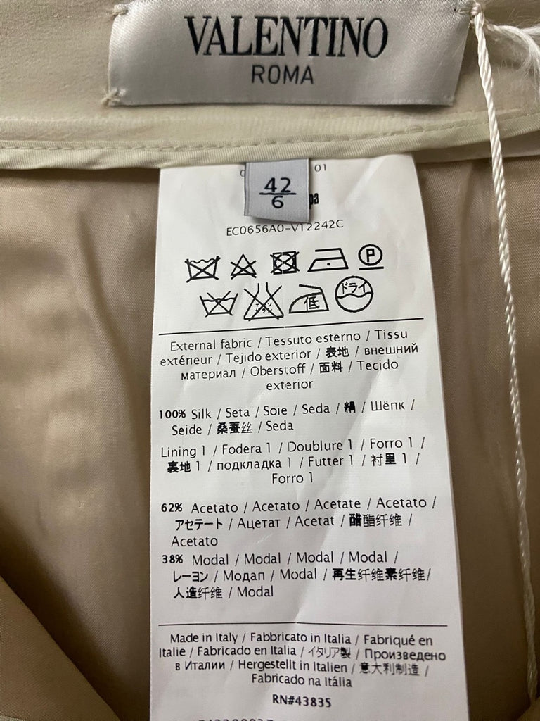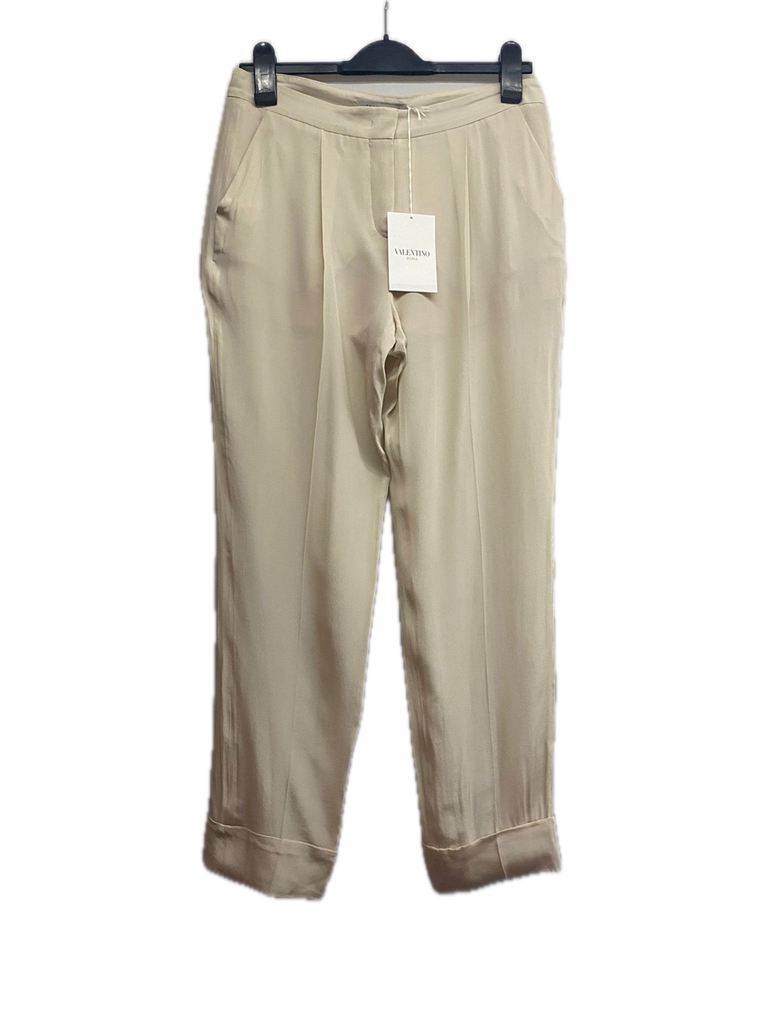 Elevate your wardrobe with these elegant Valentino Roma ivory trousers, exquisitely tailored in 100% pure silk for a fluid, refined drape. Designed with a softly tapered silhouette, they feature pressed front pleats that create clean structure while maintaining a luxuriously lightweight feel.