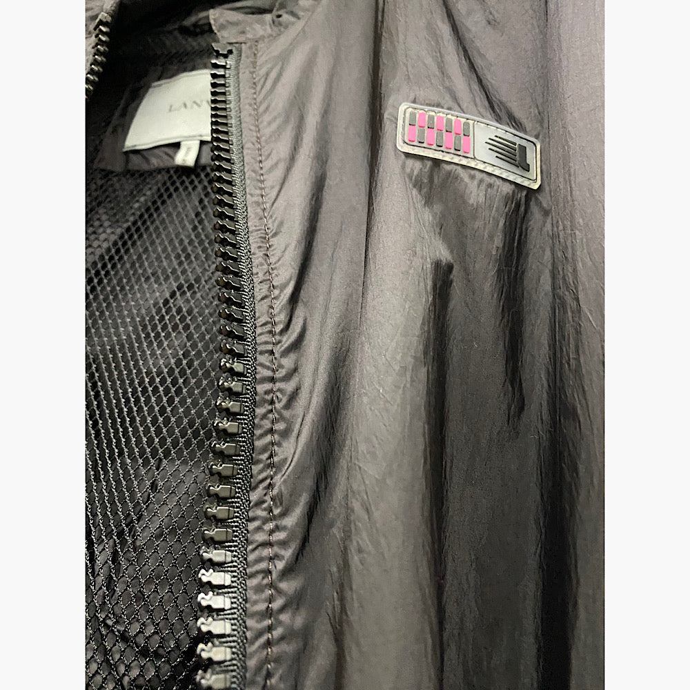 Authentic Lanvin black lightweight windbreaker jacket, combining functionality and refined design. Crafted from polyamide with a smooth, subtle sheen, it features a stand collar, front zip fastening, and adjustable drawstrings at the hem, allowing for two distinct silhouettes a cinched bomber look or a straight short trench style.The ribbed cuffs, made from pure cotton, ensure comfort and a secure fit. Signature Lanvin pink-and-black logo details appear on the zip pull and left chest, adding a touch of sophistication. The mesh lining offers breathability and lightness.A large concealed hood, hidden behind the collar and secured with a button closure, provides extra protection in windy or rainy weather. The jacket also includes two side zip pockets and a large grey Lanvin logo printed inside the collar for an elegant finish.This oversized-fit piece merges practicality and high-end style—ideal for urban wear and travel.