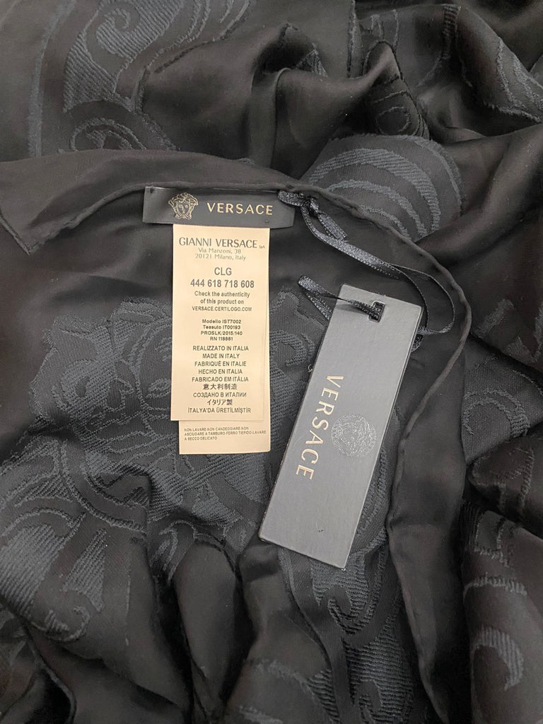 Elegant scarf by Gianni Versace, crafted in Italy from a lightweight silk-blend fabric. Designed in classic black with a subtle jacquard baroque motif, the tonal pattern is woven into the fabric, creating depth and refinement without overt branding.Soft, fluid and semi-sheer, this versatile scarf can be styled draped over the shoulders, wrapped around the neck, or used as an evening accessory. A timeless piece that reflects Versace’s signature elegance and Italian craftsmanship. Brand new with original tags attached.A refined Versace accessory combining understated luxury with classic design.