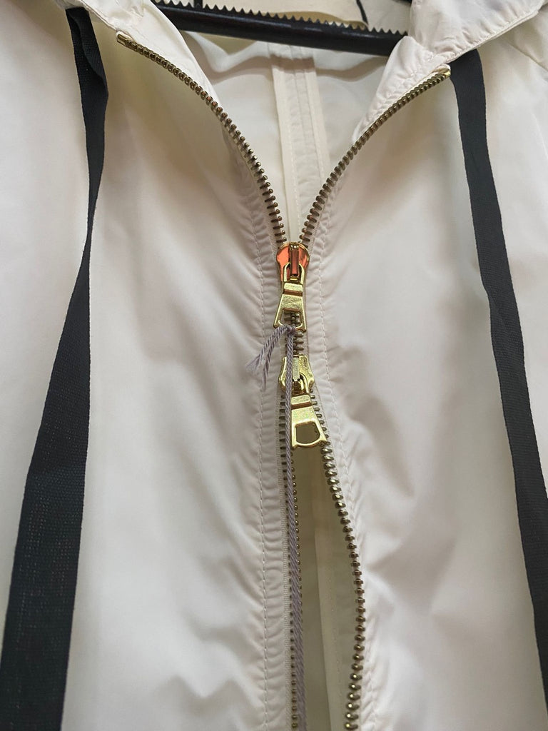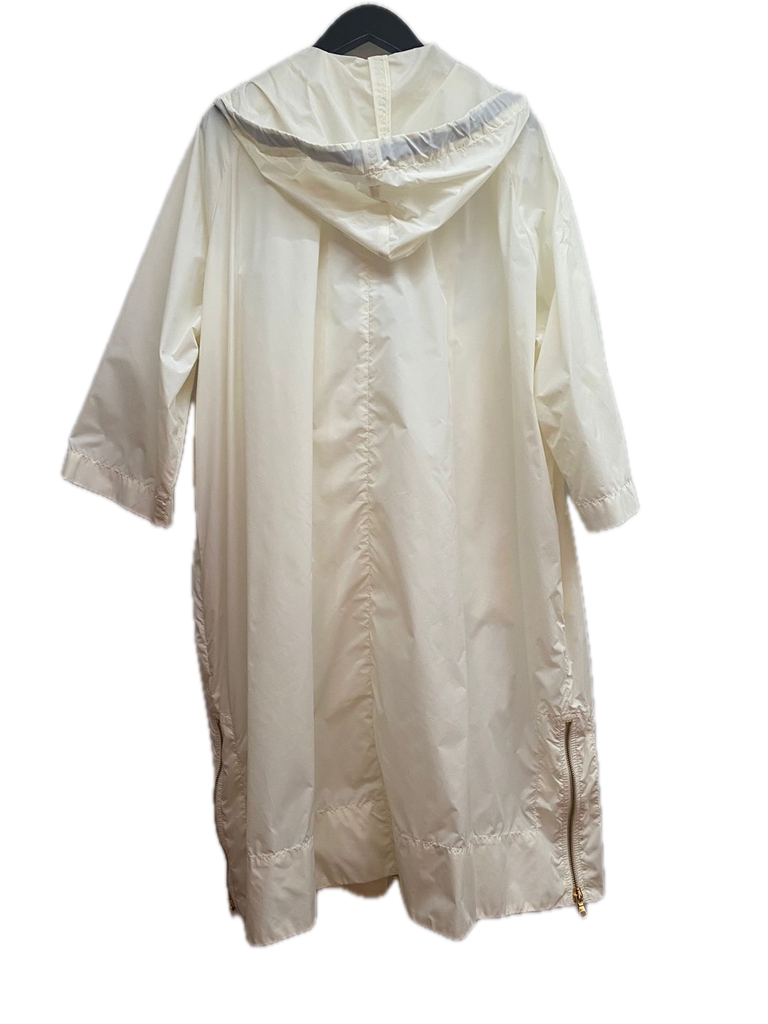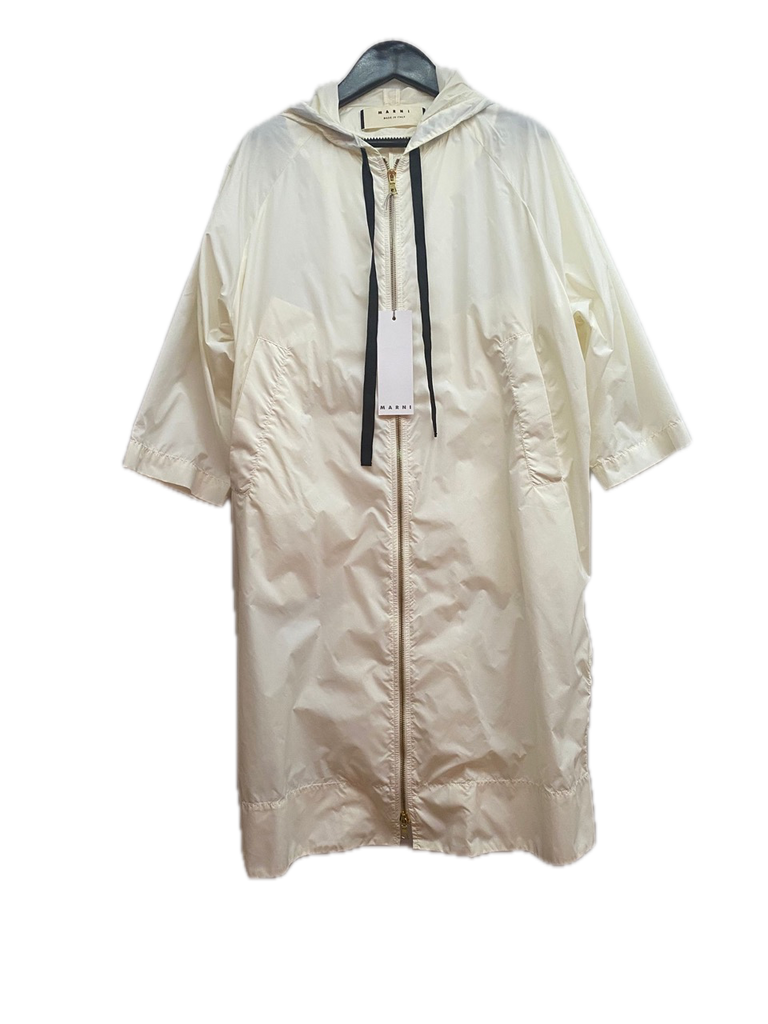 Marni lightweight hooded raincoat in soft ivory, crafted in Italy from a crisp technical fabric. Designed with a relaxed silhouette, 3/4 sleeves and a full-length zip, it offers effortless layering and a modern, understated look. Finished with contrasting drawstrings and practical side pockets — a refined yet easy everyday outer layer.